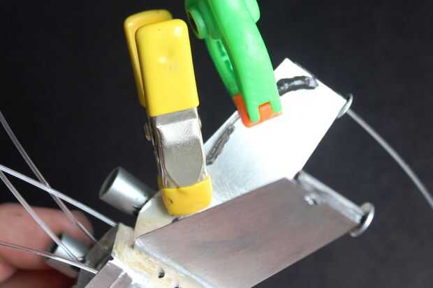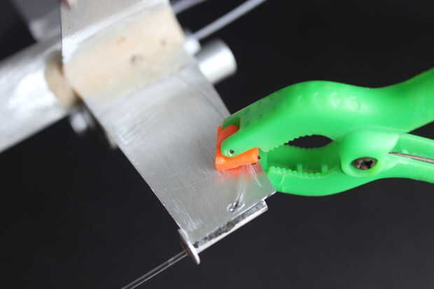 4. ejecutar las fibras del cuerpo debajo de cada una de las alas superiores, hasta y a través a la pistola de ala (remache) y pegar en la parte inferior de las alas con epoxy. Lo hice en etapas, la fibra del ala de sujeción y pegado a la mitad, luego acabado una vez que salieron de las abrazaderas.