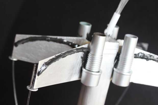 Ahora es una fibra que sale de cada pistola ala apuntando hacia delante y una fibra que viene hacia fuera de la parte trasera de cada motor. Todos los extremos de la fibra están apuntando fuera de la parte posterior del cuerpo, listo para ser cortado y atado para el ensamblaje de la luz.