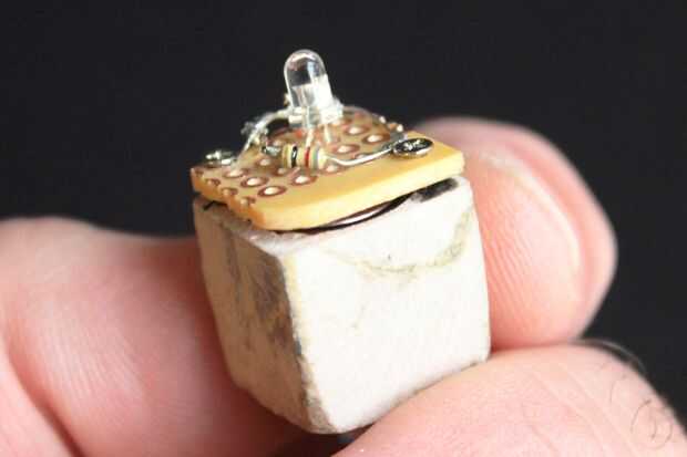 4. por último, soldar el LED a un pequeño trozo de placa de circuito y conectar el circuito. Yo 1'8 "agujeros en las dos esquinas perforados y usa los tornillos de la pulsera para fijar al bloque, en las pilas de su compartimiento.
