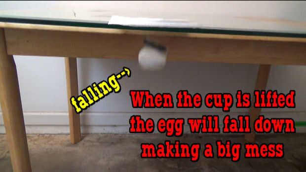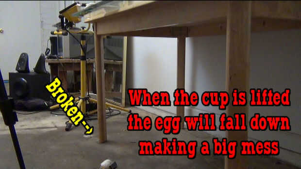 Al levanta la Copa, los dos imanes se separan y obviamente el imán con el huevo caerá al suelo, romper y hacer un lío grande en el piso.