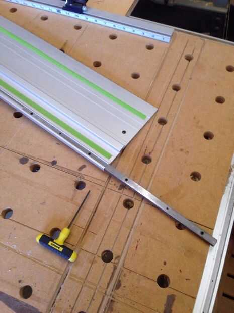 - Puede utilizar un nivel de pie de 6 u 8 para este paso. Además, carpintero vende un bonito borde recto que si tienes en tu tienda. Coloque el borde recto contra el borde posterior del riel y tire los dos rieles a la alineación hasta que haya tan poco de un espacio como usted puede conseguir entre el borde recto y los rieles.