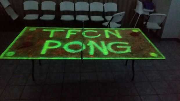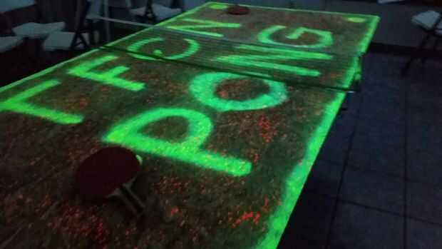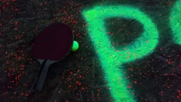 esta tabla es una tentativa en la fabricación de mesa de ping pong mejor, tocando la oscuridad. Con una luz negra, pintura fluorescente, una hoja de madera contrachapada y una red se puede hacer una gran mesa mira.