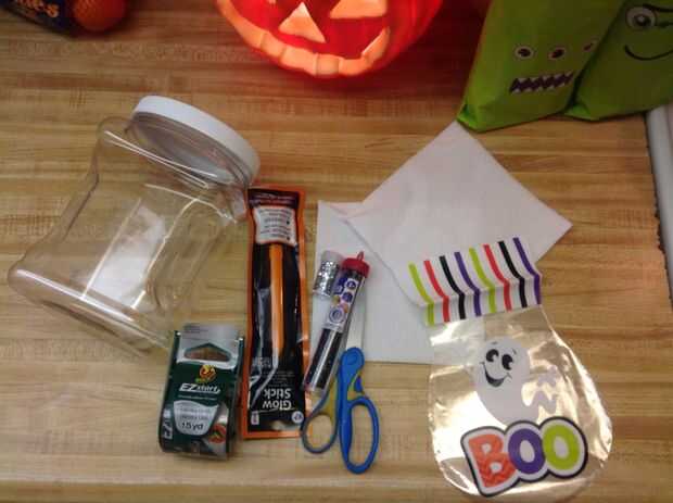 Para la primera parte de este proyecto, que necesitará una jarra (plástico o vidrio), palillo del resplandor (elección de color es el tuyo), tijeras, una para imprimir o ver a través de diseño, brillo (opcional) y algunas servilletas.