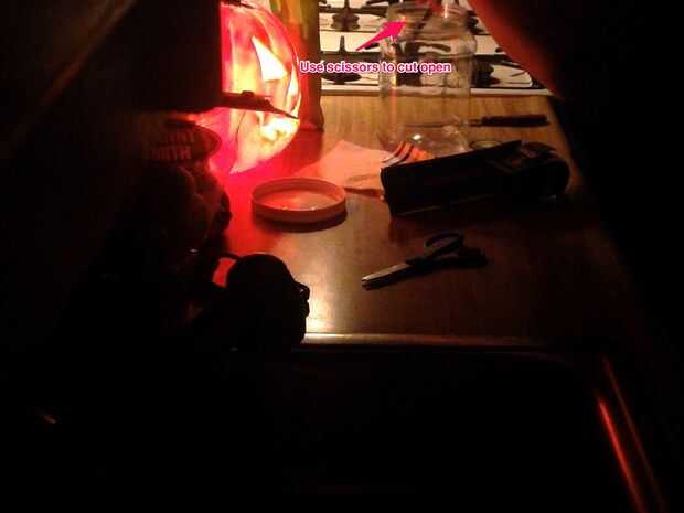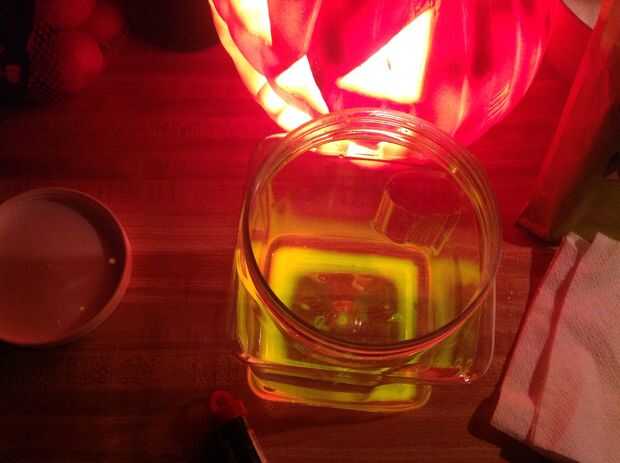A continuación, después de haber abierto el frasco, corta ambos lados de lo glowstick (para hacerlo vierta más rápido) y verter en la jarra. También, si usted decide usar glitter, vierta aquí también. Esto es donde usted utilizaría las servilletas porque este paso consigue sucio. (Nota: resplandor pega normalmente dura por cerca de 2 horas, como su vaso de resplandor en la oscuridad.)