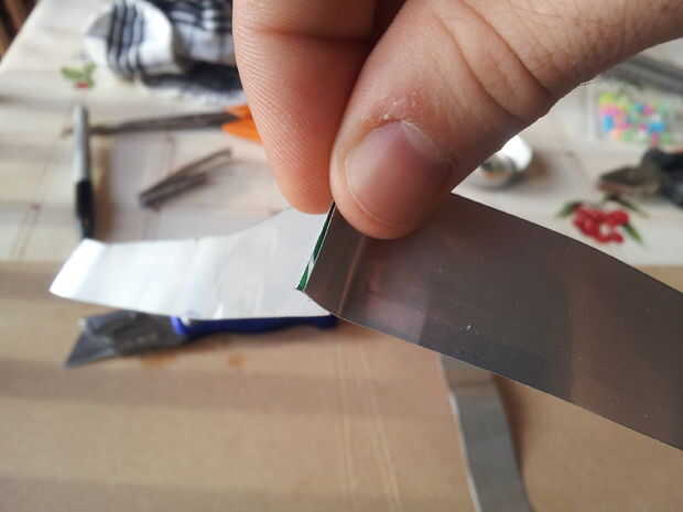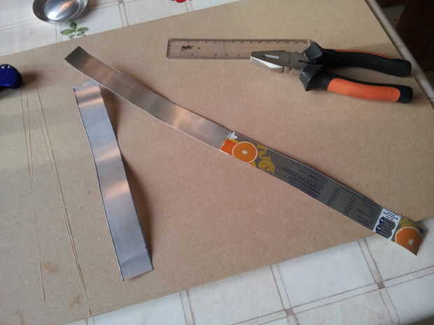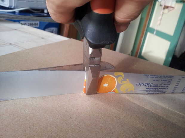 Utilice un par de pinzas para prensar (aprete) 2 tiras de metal. En esta etapa (como descubrí más adelante), es una buena idea usar pinzas para plegar esta combinación en sí mismo para hacerlo más fuerte.