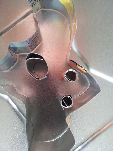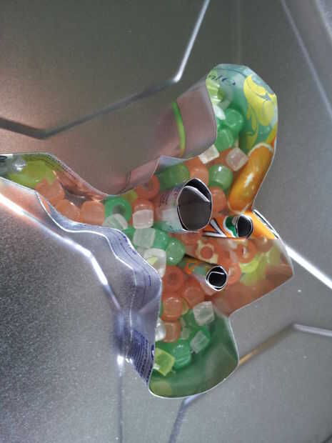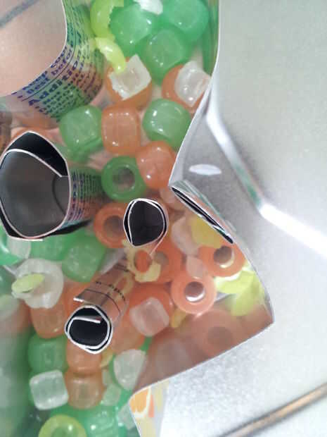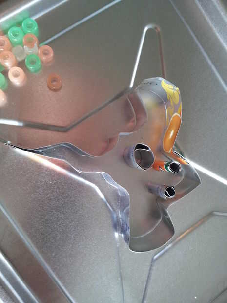 Coloque el molde sobre una bandeja de metal que se adapta a su horno y luego los ojos y las piezas de la boca. Si no de pie su propio, debe mantenerlos en su lugar con un par de dedos mientras que añadir sus cuentas al molde.