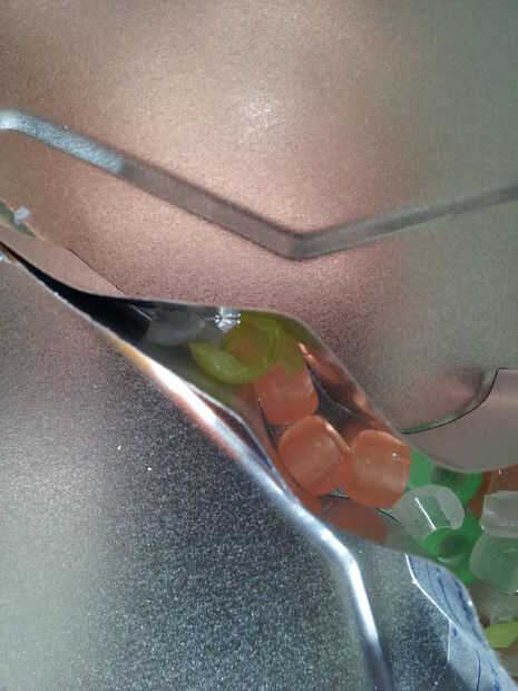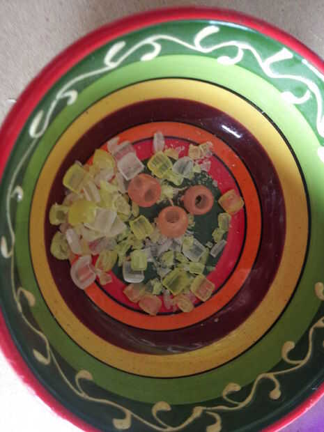 Ahora, usando un martillo, romper cuidadosamente algunos granos de coloreados similares a trocitos y espolvorear en los huecos demasiado pequeños para sus granos enteros en.