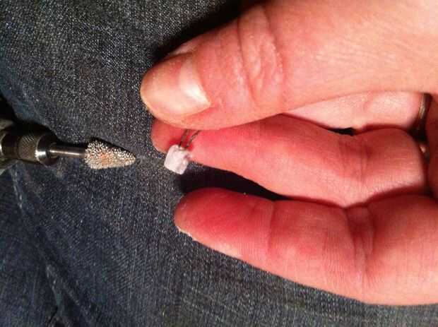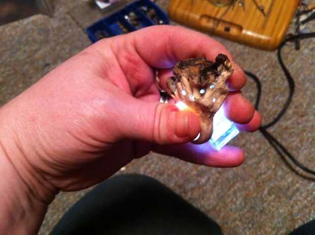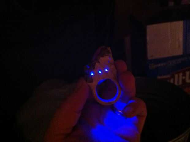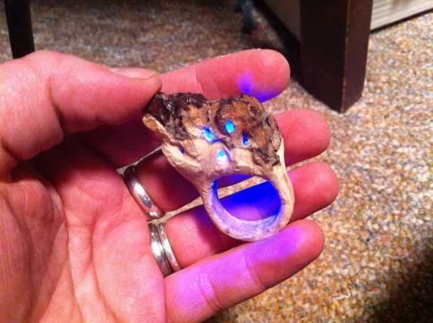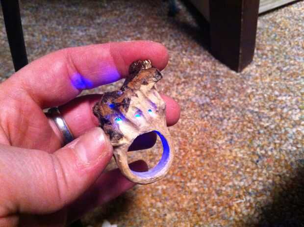 Usé una broca pequeña para perforar agujeros en la parte superior del anillo para marcar donde van las setas. Necesitaba la luz de lo LED brillan algunos arcilla translúcida y golpeó el polvo de brillo iluminan realmente.
