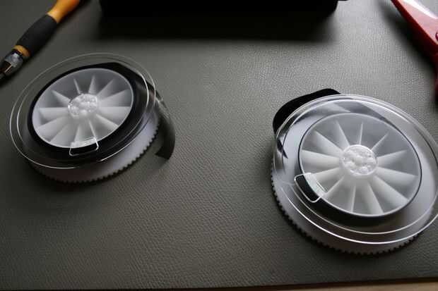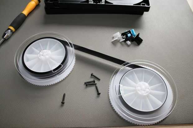Cortar la cinta y pegar los extremos apretados en los carretes (superglue sería más fácil aquí)