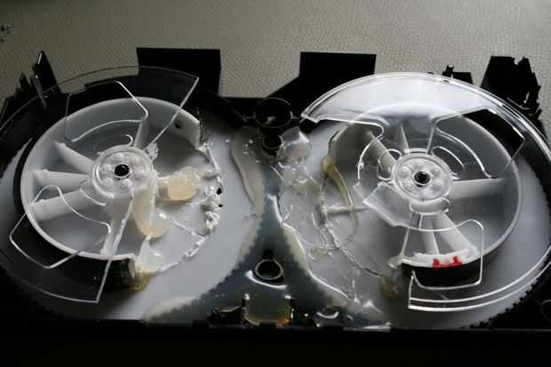 Simplemente presione la plancha caliente a través de la cinta y el plástico del carrete. Abra una ventana o hacer este exterior, los humos no son muy saludables. Tienes que quemar al menos 4 agujeros, 2 en cada carrete. No corte a todas las piezas plásticas que están en el camino del cubo, la forma más fácil es cortar con un cuchillo afilado y luego simplemente romperlo con los alicates.