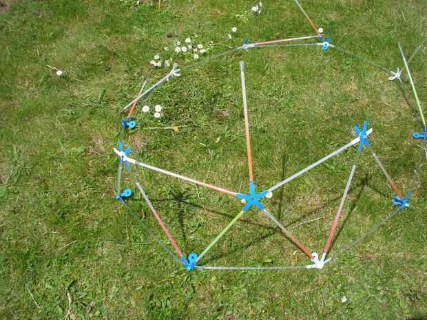 Dos patas adyacentes del cubo se conectará a las esquinas de repuesto de la base de la cúpula. Dos patas serán casi horizontales y se conectarán al Strawbees de los conectores de eje 6 patas regulares.
