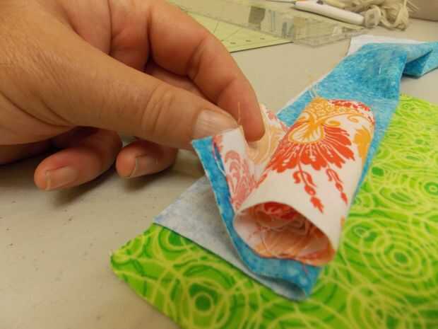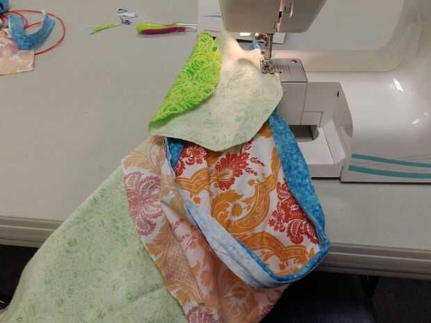 Lugar una aleta de la tubería de cara a cara con otro trozo de tela. Podrás ver los dos lados o mostrando. Cosalas juntas aproximadamente 1/4 del borde de la tela. Esto le dará una costura oculta cuando se despliegan las piezas con las caras que muestran. Añadir la siguiente pieza y luego la siguiente. Pespunteado en el extremo de cada costura aunque los expertos dijeron que esto probablemente no era necesario.
