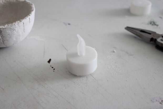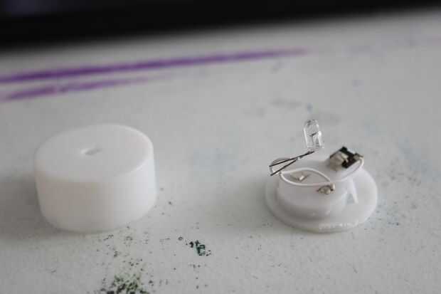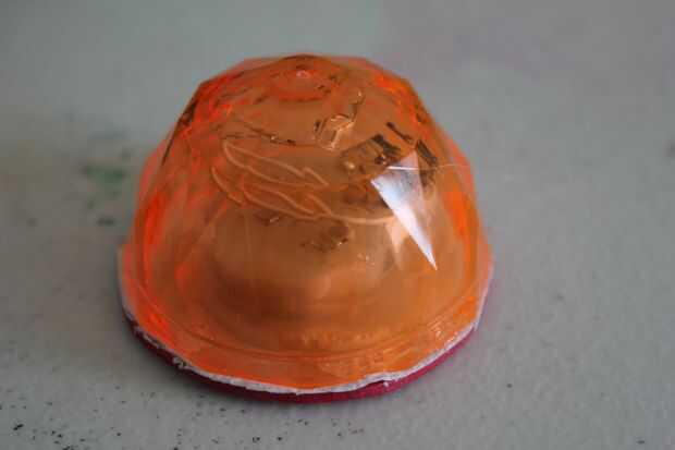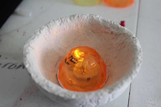 Esto es donde las cosas complicaron un poco creativo. Así que tomé una luz de té y quitar su cubierta. Asegúrese de que no dañar la luz o los cables. Luego coloque una cúpula en forma de cubierta sobre la luz. Tuve algunos transparente puesta alrededor de los huevos de Pascua. Usé la parte inferior la mitad y coloque sobre la luz para asegurarse de que encaja. A continuación, cree una base para sostener todo junto. He utilizado una hoja de la espuma que tenía un adhesivo detrás. Una vez que todo lo sostiene juntos, prueba de la luz para asegurarse de que todavía funciona.