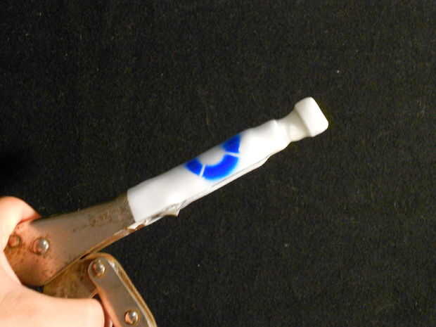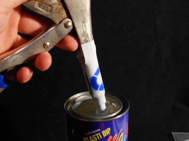 Con la pintura seca quita el enmascaramiento en la parte superior (pero mantiene los hilos enmascarados y el papel en lugar de la ranura) y nos dispusimos a sumergir el mango. Las instrucciones de Plasti Dip decir mojar una pulgada cada 5 segundos y lo saque lentamente también. Me pareció más fácil contar de pulgadas de trimestre cada segundo (centímetros haría sólo así). No sé si usted necesita ir tan lento, pero funcionaba.