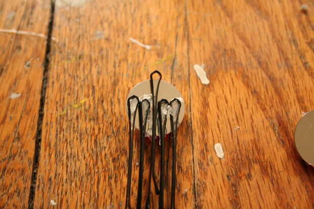 En primer lugar, pegar unas horquillas en la parte posterior de las parte posterior plana pendientes. He utilizado 5 de ellos. Pegue una horquilla más en la parte superior, asegurándose de que se extiende hacia fuera en la parte superior. Esto es donde te bucle del gancho de anillo y pendiente del salto.