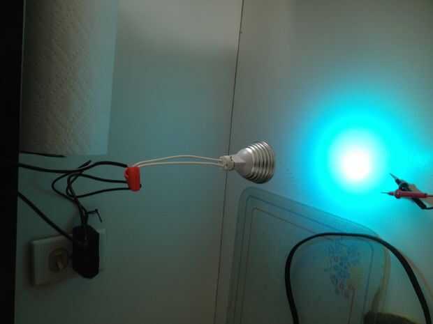 Primero probé el LED en un artefacto tenía, entonces prueba con el adaptador de corriente. Decidí cortar el extremo y el alambre en un interruptor. Ya que el LED tiene un botón de apagado del mando a distancia la próxima vez sólo podría comprar el enchufe hembra del círculo que coincide y use.