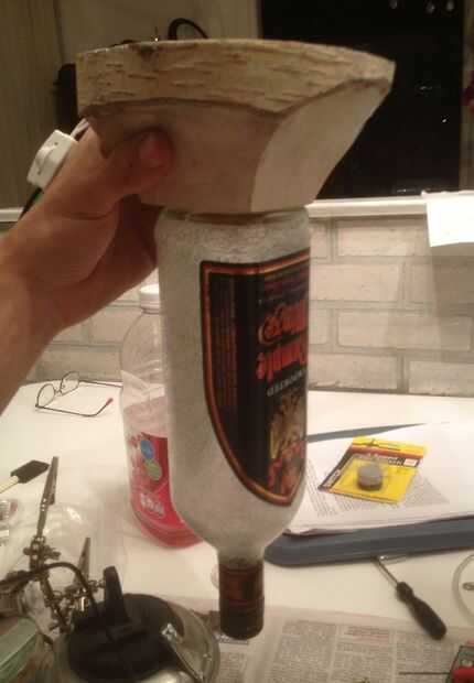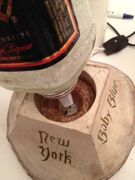 "Fijé" la botella a la base colocando el LED directamente a la parte inferior de la botella. Lo hice porque la botella estaba un poco tambaleante debido a no ser capaz de hacer el guión lo suficientemente profundo * bulbo no podía ir cualquier inferior *. Con el zócalo atornillado firmemente a la base y fuertemente a la botella, el LED conectado en (que no es demasiado difícil de hacer) la botella se convierte mantiene firmemente en su lugar. El LED fue unido a la parte inferior de la botella con una capa delgada cinta de doble cara y luego algunas piezas de la cinta doble cara blanda gruesa venden por todas partes.