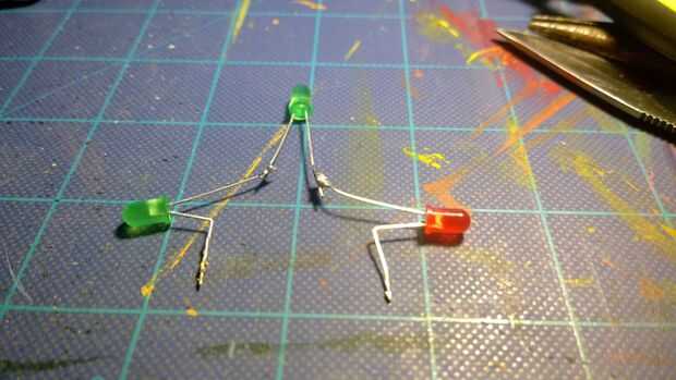 El lado del ánodo de los conjuntos de LED a la resistencia de la soldadura y la soldadura de la resistencia en el riel de 9V. Cátodo para el carril de tierra de la soldadura.