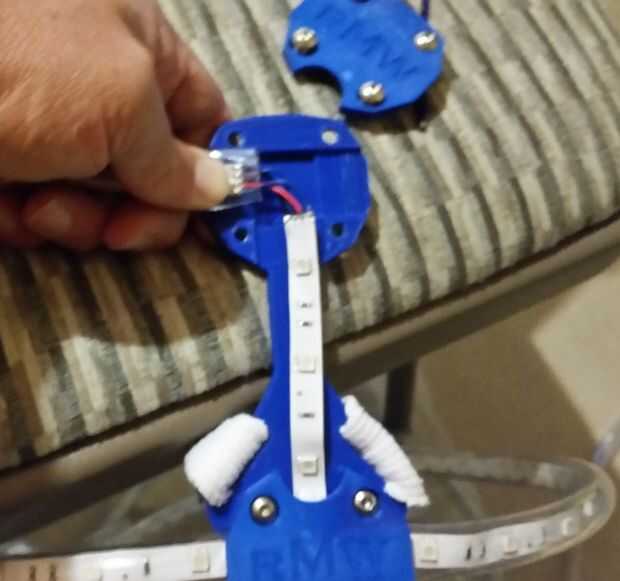 - Retire el papel de los segmentos de LED de cuello. La tira de LED debe estar pegajosa y se pegue en el cuello de plástico.