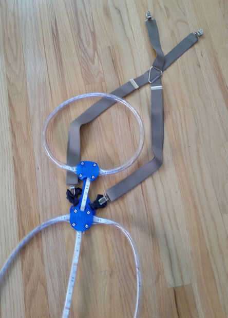 Los marcos de plástico están diseñados para permitir que dos correas de hombros apoyar el soporte superior y un cinturón para apoyar el soporte de cintura. Usé un viejo par de tirantes y un cinturón (se pueden comprar ligas similares en Walmart por $6).