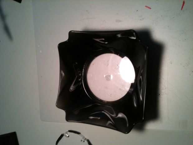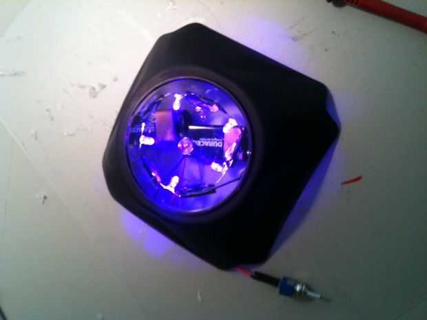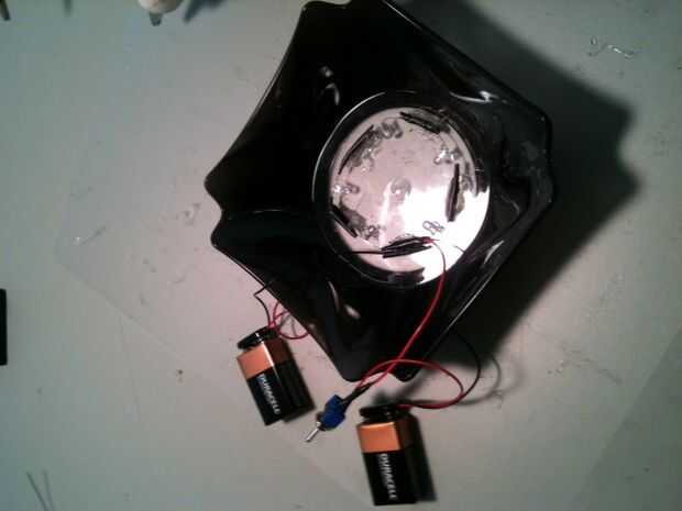 Cuando haya terminado con este paso, usted debe poder invierta el recipiente y las luces de UV brillante hacia fuera la parte superior, y también con los cables, baterías y conmutadores ocultos, pero todavía algo accesible. ¡ Listo con la base de la fuente!