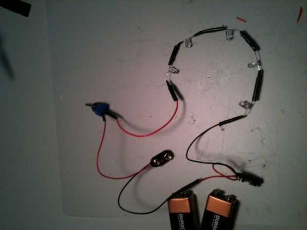 Mientras que la pintura se está secando, conectar tu LED. Hay toneladas de referencias sobre cómo hacerlo, para no repetirlos (además, yo soy sólo un principiante en electrónica, así que no tome mi palabra como ley, pero tenga en cuenta que las luces UV pueden necesitar un poco más poder que lo llevaría a un LED rojo regular). He utilizado 5 UV LED y soldado junto con dos baterías de 9 voltios y un interruptor para completar el circuito. Yo no estaba siendo lujo aquí puesto que esta parte no se ve, usé sólo algunos cinta aislante y pegamento caliente para fijar el LED en la parte inferior dentro de parte de mi tazón pequeño así que brillan a través de la parte no pintada. El interruptor y las baterías son simplemente sueltas para que puedan ser fácilmente acceder una vez que está configurado el ponche y lleno.