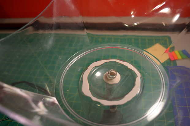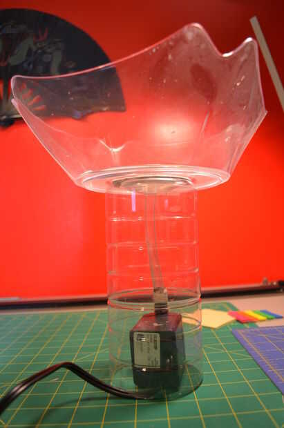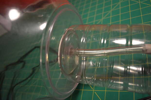 El siguiente es el aspersor. En este caso, usé un recipiente plástico vacío de queso parmesano. Corte la parte inferior tenía un cilindro con dos extremos abiertos. Corte una ranura para el cable de la bomba a salir en un extremo y también meter un par de orificios de ventilación para permitir que el líquido dentro del cilindro. Utilice algunos más masilla para sellar el extremo sin la muesca en la parte inferior de la taza con la tubería plástica. Corte el tubo de modo que cuando se conecta a la bomba, la tubería y la bomba juntos será sobre la misma longitud que el cilindro. Utilicé algunos epoxy más para sellar la tubería a la bomba, pero por supuesto esto es opcional si el tubo se ajusta perfectamente.