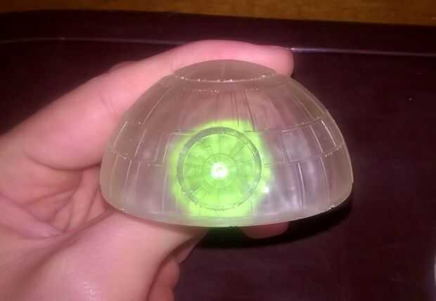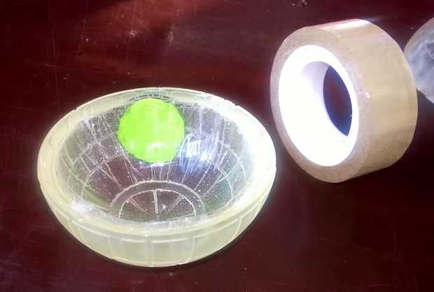 En lugar de agregar un LED verde separado para las luces en el plato de superláser, sólo podemos utilizar papel crepé verde. Cortar un par de piezas redondas de papel lo suficientemente grande como para cubrir el plato en el interior, apilarlos uno encima del otro y usar algunos pegajosa cinta a ellos en el interior del molde, para que estén detrás del plato. No importa si están un poco fuera de la zona del plato, recuerde cuando nos estamos perforación las luces no hacer demasiado cerca al plato.