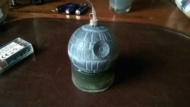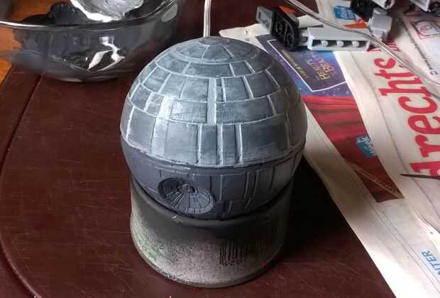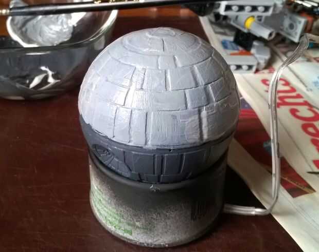 Pintar rápidamente un hemisferio de la estrella de la muerte, asegurándose de obtener la pintura en todas las ranuras pequeñas. Inmediatamente después, use una toalla de papel para limpiar la pintura mojada otra vez: la pintura en las ranuras quedarán, mirada agradable y recta. El resto de la estrella de la muerte conseguirá una bruma gris sobre ella, pero eso es bueno ya que pintamos la capa más oscura un poco demasiado oscuro. Además, esto le da una sensación de textura. Tómese su tiempo para arreglar pequeños detalles a mano.