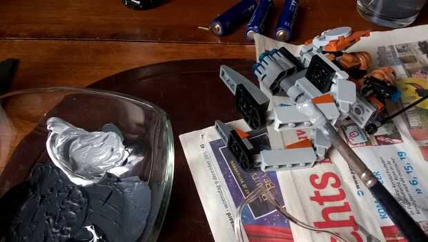 Trincheras de la estrella de la muerte son un gris más ligero que el resto de la estación. Una vez más, utilicé Lego como una referencia de color. Es un dolor real para obtener bordes bonito, recta, pintados a mano por ahi, y puedes probar si quieres, pero yo personalmente prefiero una técnica diferente. Diluye la pintura con un poco de agua para hacer un poco más que moquea por cargar el pincel con un poco de pintura y luego la inmersión en un vaso de agua.