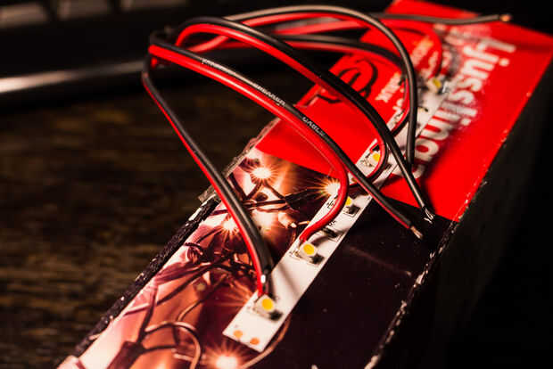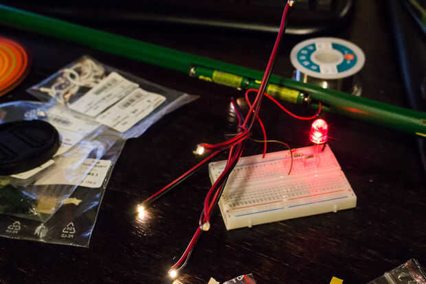 Después de esto siguió una pequeña prueba en un protoboard con resistencias planeaba usar y afortunadamente funcionó según lo previsto. Usé una resistencia de 10 ohmios solo antes de la estrella del LED y luego 2 más resistencias de 10 ohmios en serie antes el LED rojo. Es debido a que 2 AAAs en serie salida 3V 3528 LED blanco funciona en 3-3, 4V y un LED rojo en la parte superior funciona en 1,8 a 2, 5V. Probablemente debería han evitado la resistencia antes de la estrella y tenía LED más brillante de esa manera, pero le pareció bien al tiempo que.