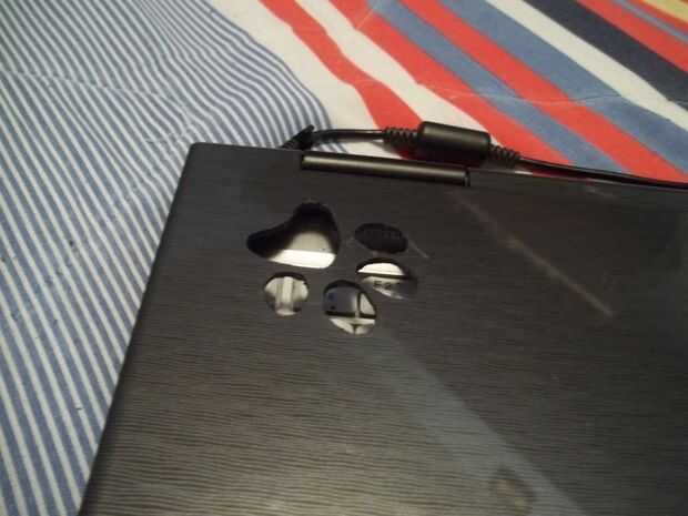 un chico en el hackerspace perdió algunos de los pequeños pies de goma que mantienen la distancia entre su portátil y el escritorio para permitir un enfriamiento eficaz. Él utilizó Sugru rojo de crear otros nuevos que pegadas en el lugar adecuado y g