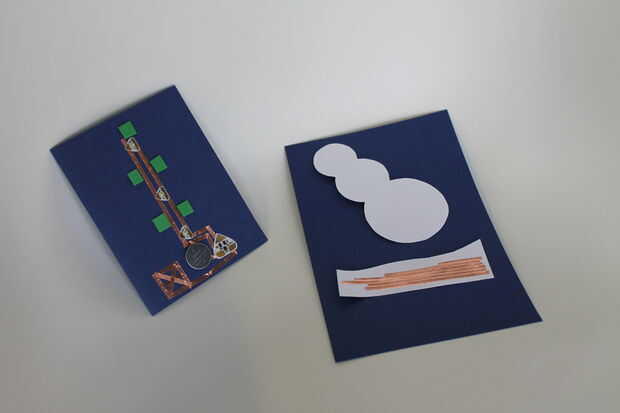 Corte una tira de cartulina del ancho de la tarjeta sea el suelo por debajo de su muñeco de nieve. Aplique una tira gruesa de cinta de cobre en la parte posterior. Pegue los bordes de la pieza de suelo a la parte delantera de la tarjeta.