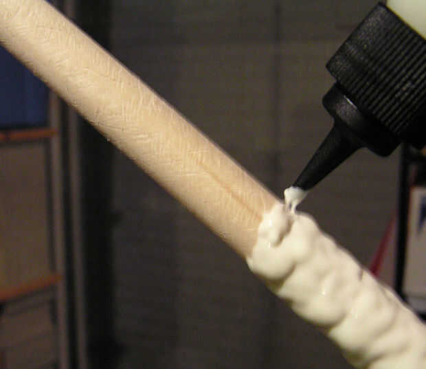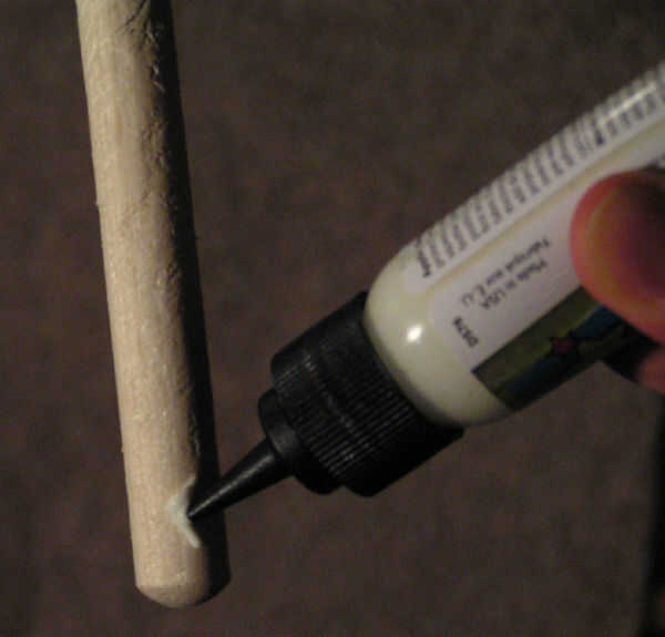 Apriete la pintura sobre el palo, a partir de la parte inferior. Trabajo en círculos o zig zag patrones y tratar de mantener la punta justo al lado de la superficie del palo. Utilice la otra mano para girar el palo como aplicar la pintura con la otra. Puede utilizar la punta para empujar la pintura para asegurarse de que está recubierto el palo. Está bien poner en espesor; no desea tanto que gotea hacia abajo la palanca. Recuerda que esto es pintura "dimensional" y está destinado a ser más gruesa que la mayoría de las pinturas.