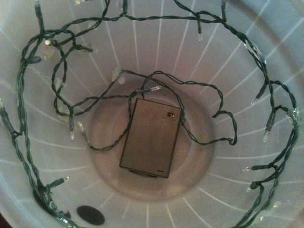 Poner los LEDs en el cubo y pegamento caliente las luces en el interior de la cubeta y el compartimento en la parte inferior.