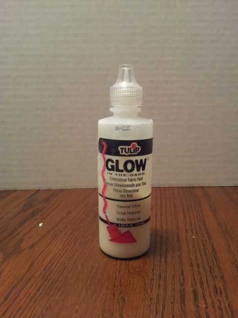 La verdadera estrella del espectáculo era pintura tela brilla en la oscuridad de tulipán. He utilizado un poco en dos botellas de las cosas, y lo tengo en mi local JoAnn. Después cosí la prenda inicial, había pintado el paño de algodón con dos capas de las cosas y deje secar.