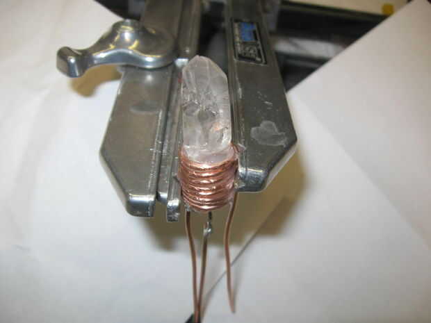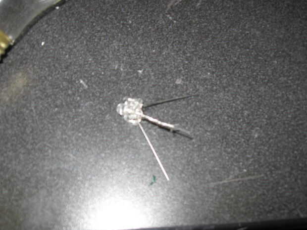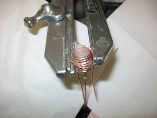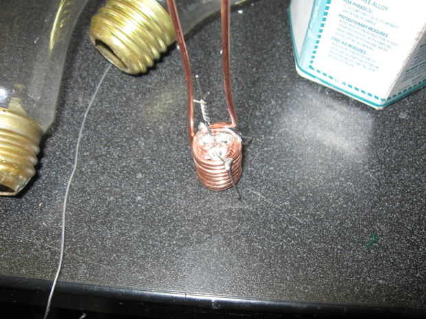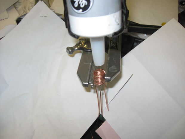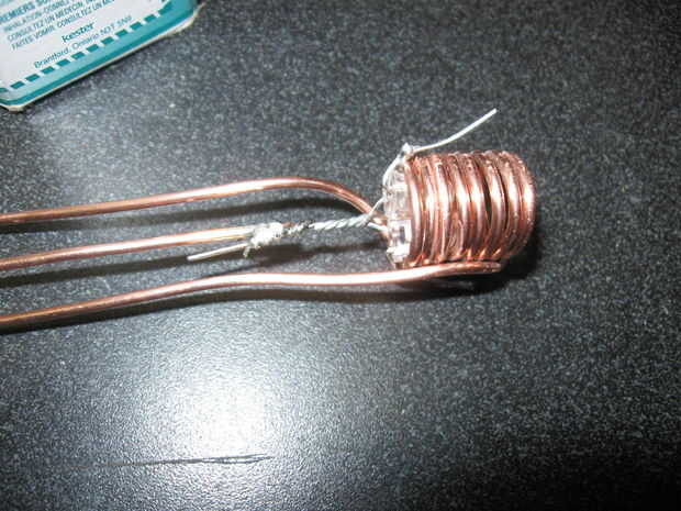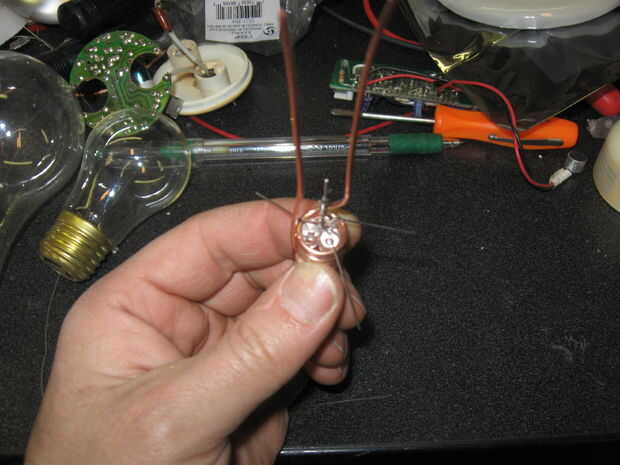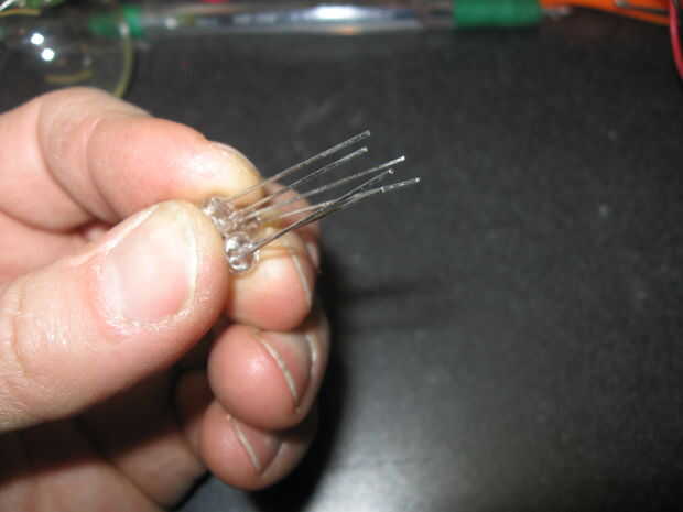 Presione el ensamblaje de led en la base y doblar los cables largos que tocan el soporte de alambre de cobre. Los 3 cables en su lugar sobre el soporte de la soldadura.