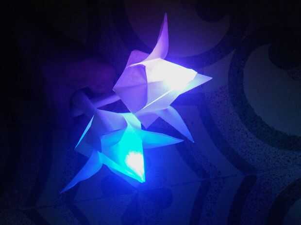 Construir este brillante decoración de la mesa con sus hijos! Se necesitan dos tiras de papel ancho de 2cm, un palillo del pegamento, un led y una batería de 3V la moneda.Paso 1: doblar. Preparar dos tiras de papel ancho de largo 2cm.Colocar en un án