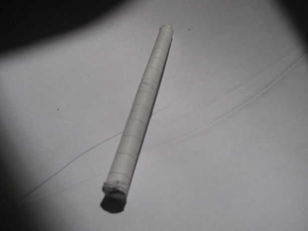 Ok estamos todas más terminados sólo tenemos que llenar el tubo. Para llenar el tubo vamos a necesitar algún papel más sólo utilicé el papel sobrante de mi tubo. Ahora un trozo de papel y ponerlo en su puesto de trabajo y luego con otro pedazo del doblez del papel en la mitad luego abrirlo, este pedazo de papel servirá como un embudo. Tomar el tubo y sosténgala sobre el pedazo de papel utilizando su cuchara cucharada algún polvo en el embudo y empujarlo lentamente en. Si alguno se cae del tubo el papel bajo neath a atraparla y se puede poner en el embudo. Recuerde que sacudan el tubo un poco uniformemente extendido el compuesto una vez que el tubo está lleno, cierra la parte superior encima de la misma manera que cierra la parte inferior. Ahora todo lo que tenemos que hacer es cinta o atar a nuestro alambre o poste y terminados.