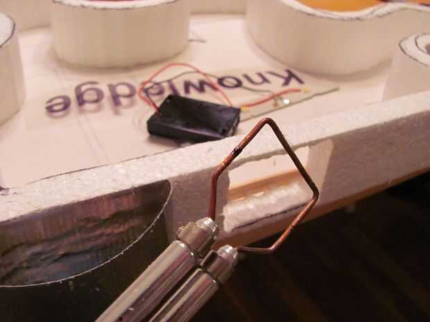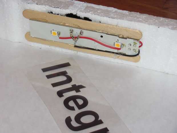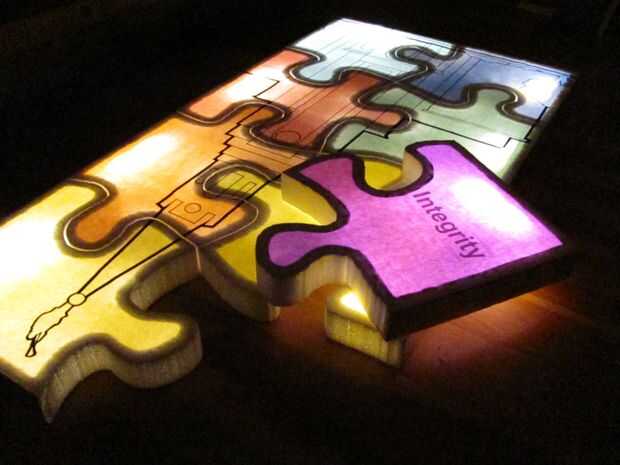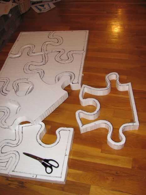 Las piezas fueron cortadas de la lámina de espuma de poliestireno con un cortador de alambre caliente hecha en casa. Las fuentes de luz eran LEDs blancos recuperados las piezas aprovechables de otro dispositivo y caliente pegado dentro de cada pieza en el lado que terminaría en el perímetro del rompecabezas armado. Un bolsillo detrás de los LED de la batería (3 x AAA) fue cortado en la pared de la pieza con un cautín de pistola 'personalizado'. El borde de la pieza con el paquete de baterías se cubrió con cinta metálica plata para mantener las baterías en su lugar y dar el rompecabezas terminado un borde de plata.