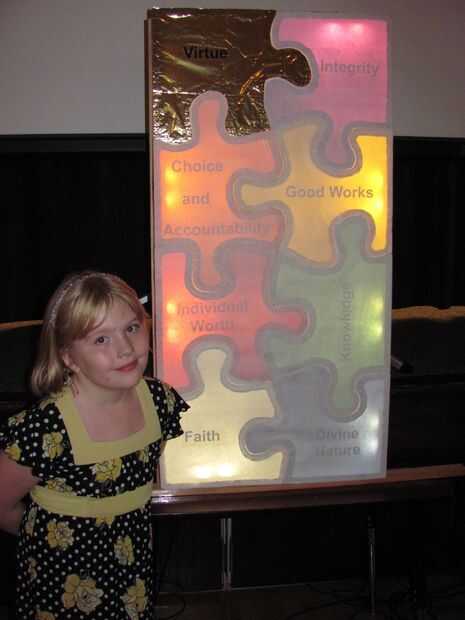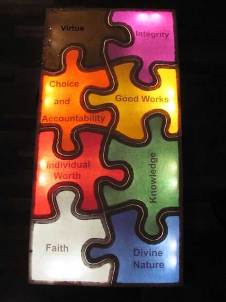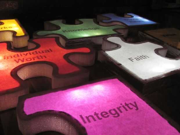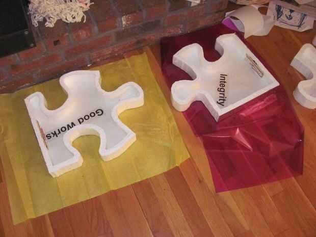 Los pedazos fueron hechos para una función de iglesia. Cada pieza era un color diferente y había escrito una palabra de valor en él. Las piezas sirven como pedazos de centro de mesa individual y más tarde fueron reunidas y entrelazadas durante la presentación de la noche.