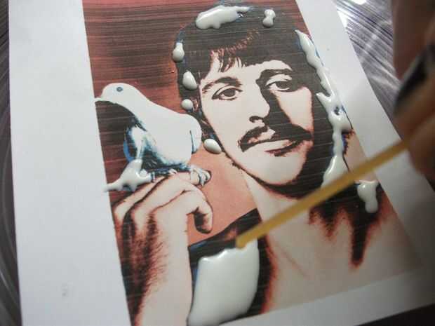 Por ejemplo, comencé cubriendo la parte azul, por lo que había aplicado Pegamento sólo en las partes azules. Cuidado: no cometer errores en este punto.
