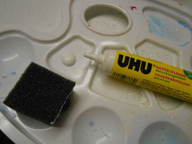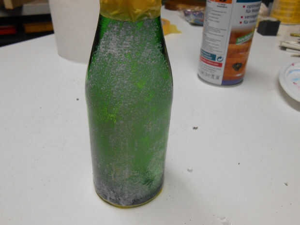 Utilizar el periódico como base de la mesa y cubrir el resto de la botella con pegamento. Además el suelo de la