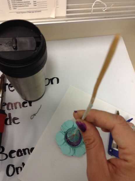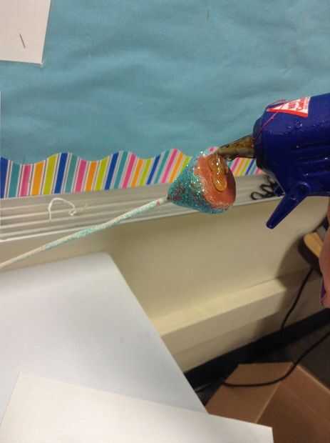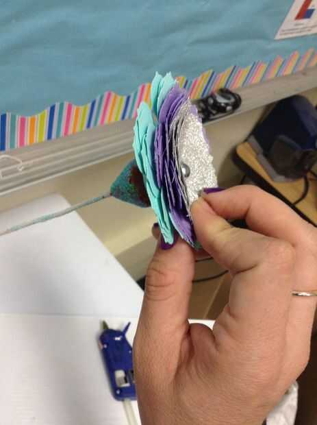 Poner pegamento caliente en la superficie plana/sin pintar de la arcilla. Coloque cuidadosamente una flor encima de la cola.