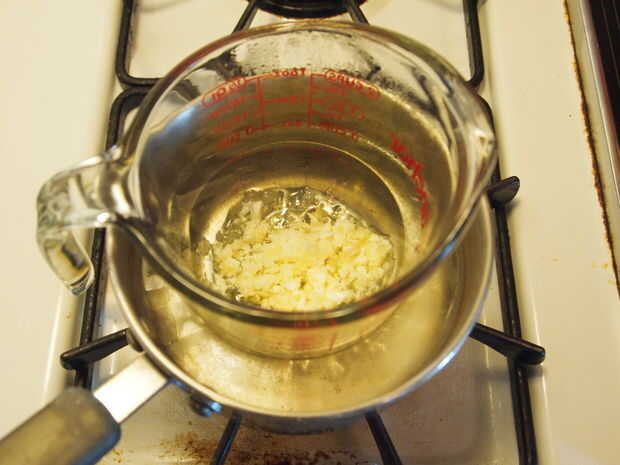Usted necesitará llenar una olla con agua, colóquelo en la estufa y deje que se cocine a fuego lento. Luego saca un frasco de vidrio. Tomar la cera de abejas, manteca de cacao (o manteca de karité) y colocar en la jarra de vidrio. Una vez que está hirviendo el agua en la estufa, tome el tarro de cristal con la cera y la manteca de cacao y el lugar que en el agua con cuidado. Ver imagen de demostración. Utilicé un palillo de brocheta de madera para mezclar esto ya se estaba derritiendo. Una vez derretida, luego agregar los aceites en él, mezcla. Entonces saca tu lápiz labial y cortar un pedazo de él y en la mezcla derretida en el recipiente de vidrio. Quitar rápidamente el calor.