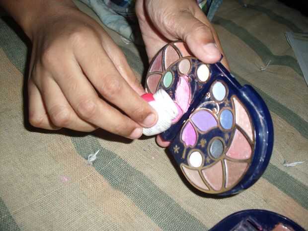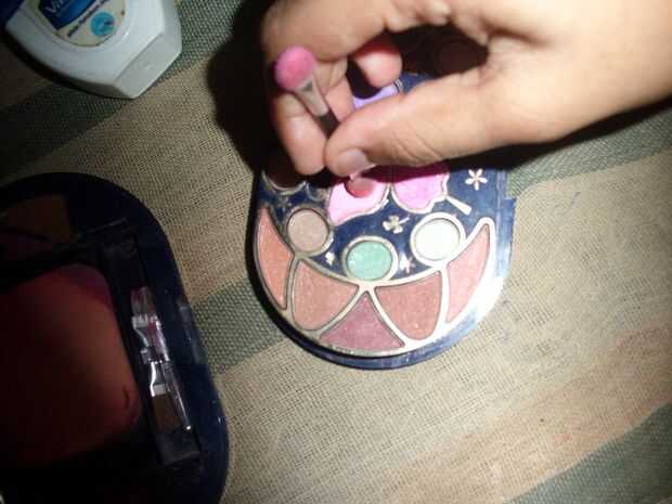 ahora tomar un cepillo de sombra de ojos y sombra de ojos y quitar las de cepillo y ponga en el envase.