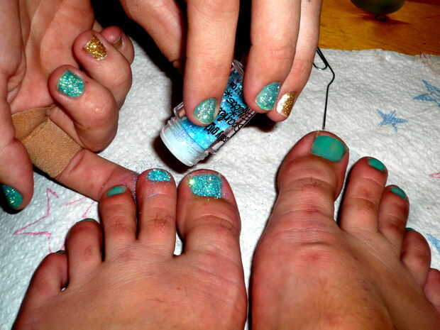 Colocar una toalla de papel bajo sus pies para atrapar el exceso brillo.  Aplique una capa de endurecedor de uñas en un clavo, luego inmediatamente espolvorear una capa de brillo de uñas mientras está todavía húmedo. Golpee suavemente el dedo para quitar brillo extra.  Pasemos al siguiente clavo y repita el proceso hasta que todos los clavos han sido brillaban. Utilice el clip de papel otra vez para afilar los bordes.