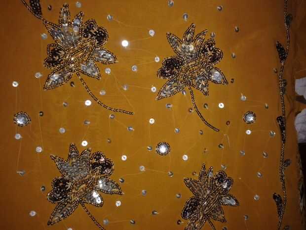 Primero uno es una blusa, y luego dos saris. Estos son los diseños que hace.