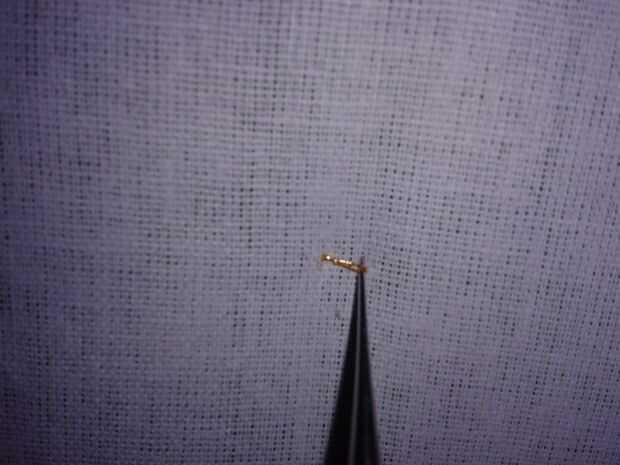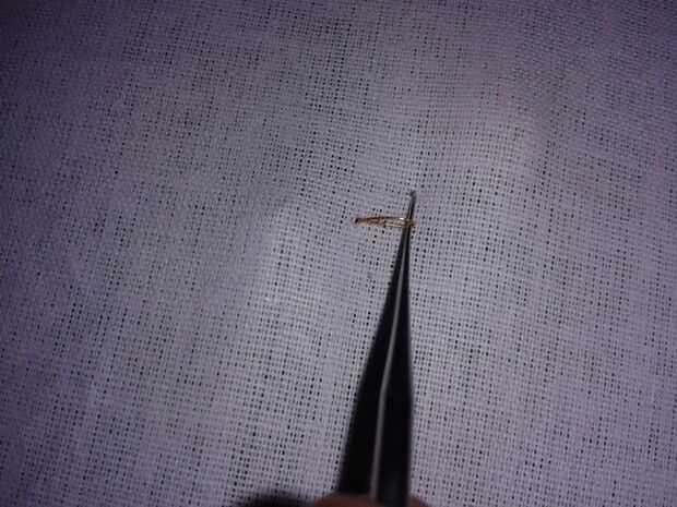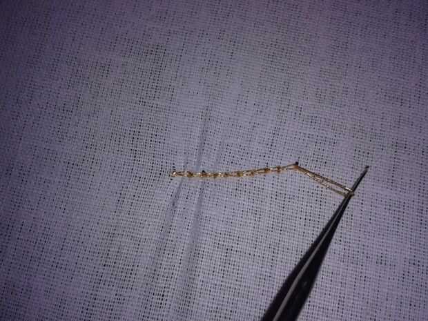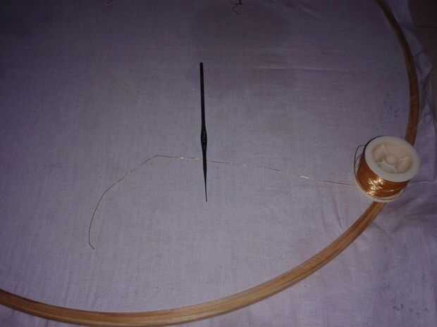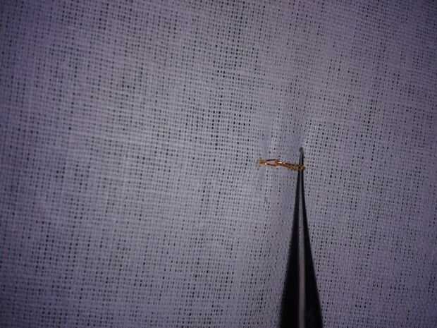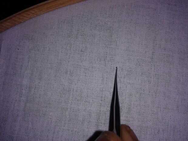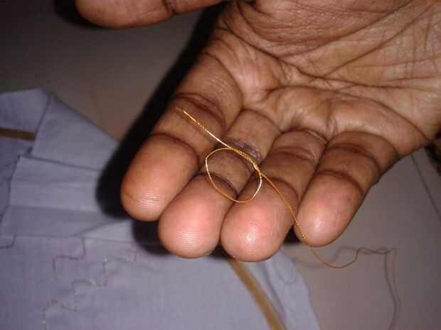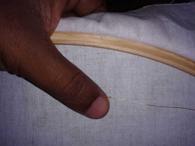 8) el hilo sale a través de la tela mientras que tirar por el hilo en el gancho de la aguja. Pero debido a un lado que el nudo en el hilo y en el otro lado del hilo es largo en el rollo se ve un hilo de forma oval sobre la tela y la aguja está en el centro de esa forma ovalada.