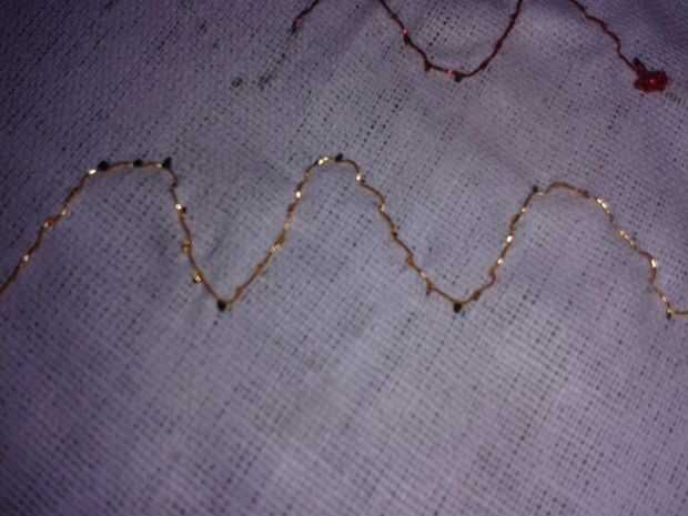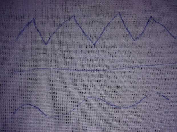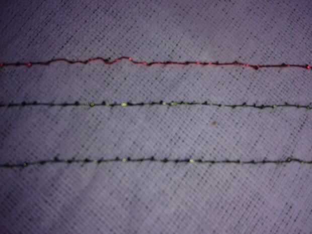 1) trazar una línea recta sobre la tela con lápiz y hacer trabajo de aari sobre la línea.